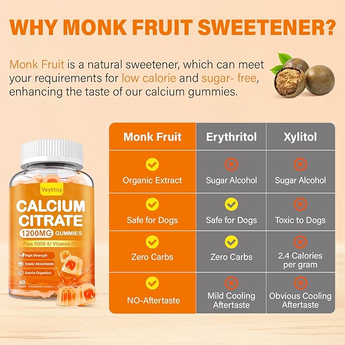 - SUGAR-FREE CALCIUM GUMMIES FOR WOMEN & MEN: Our calcium citrate with vitamin d3 gummies are rich in NATURAL STRAWBERRY FLAVOR and sweetened with MONK FRUIT—with no aftertaste! Made from edible pectin and premium vegan ingredients, these gummies are EASY TO D IGEST and provide a non stick chewing experience. Compared with capsules and tablets that are difficult to swallow, our delicious calcium citrate 1200 mg gummies are more easily accepted and suitable for men, women, vegetarians, and vegans.