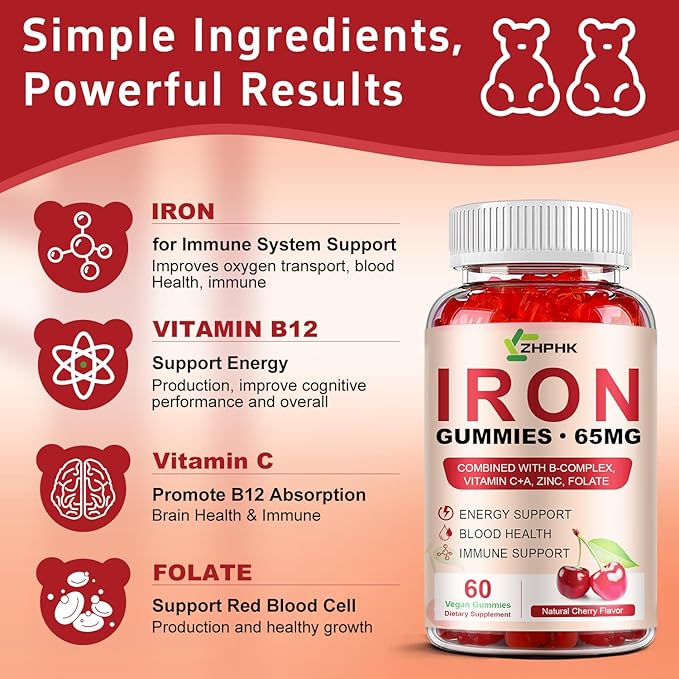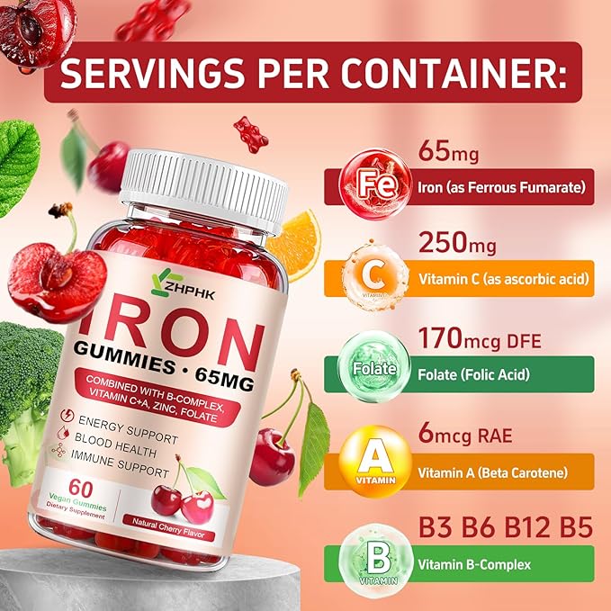 - Iron-Rich Gummies: Our iron supplement for women and men is packed with essential nutrients (minerals and multivitamin), Each serving contains 65mg of Iron and 250mg of Vitamin C to help with absorption, Zinc and Folic Acid make it best iron gummies for anemia. Which supports iron in promoting the growth of red blood cells, and also help your body increases energy and decreases fatigue