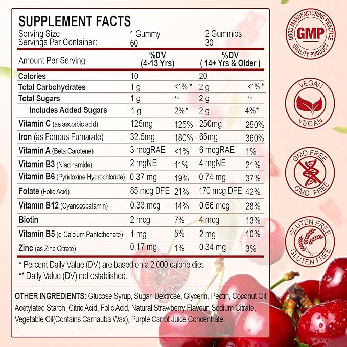 - Delicious Cherry Flavor: Indulge in the sweet, fruity flavor of fresh Cherry with every bite. Our gummies are designed to be a treat for your taste buds, making it easy to enjoy your daily iron supplement