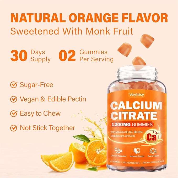 - DELICIOUS, HEALTHY CALCIUM GUMMIES: Enjoy the NATURAL ORANGE FLAVOR of our 1200 mg calcium gummies, sweetened with monk fruit for a SUGAR-FREE, guilt-free treat. Made from vegan, edible pectin, they are easy to chew and won't stick together. FREE FROM GMO, gluten free, free of gelatin, synthetic colors, artificial flavors, and preservatives, our calcium gummies are EASY TO D IGEST, pose NO BURDEN on the body. Every gummy certified by GMP and third-party testing for purity and potency.