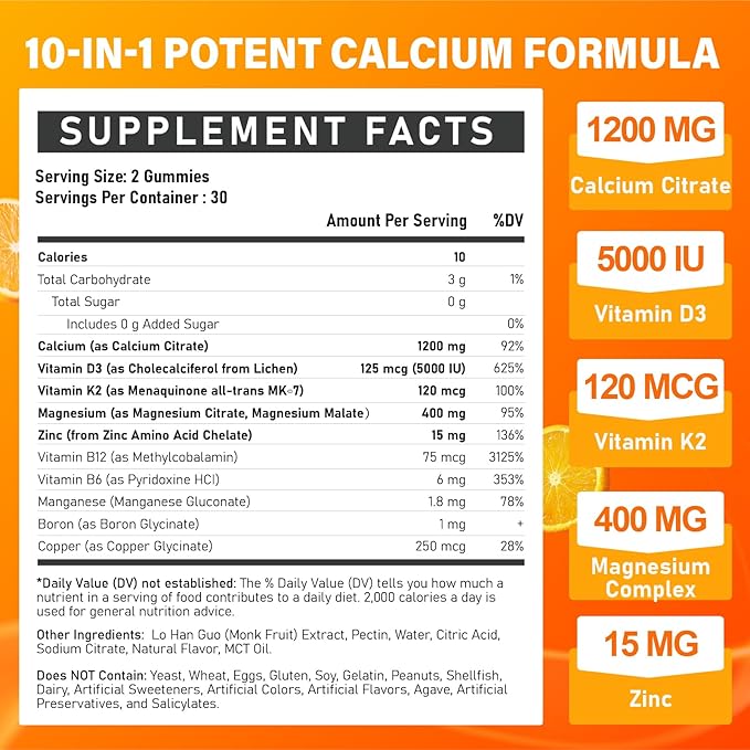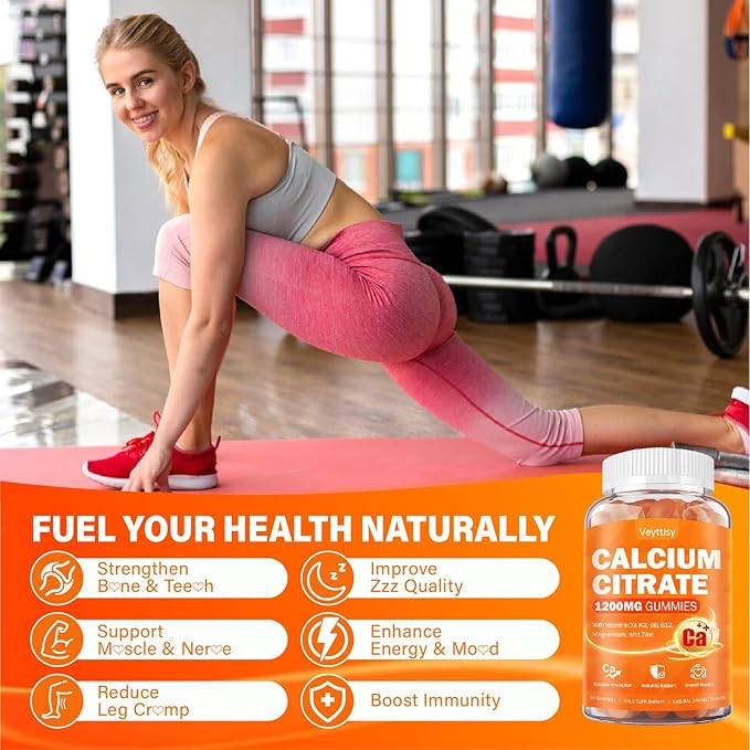 - ESSENTIAL MINERALS AND VITAMINS FOR BODY HEALTH: Our calcium 1200 mg gummies features a specially formulated blend with 1200 mg of highly bioavailable calcium citrate,which can effectively enhance overall b0ne and teet h health. Meanwhile, these mineral and vitamin enriched calcium gummies is crucial for m uscle function, further boost your health. Choose our 1200mg calcium supplement as your preferred solution for enhancing body support and active life!
