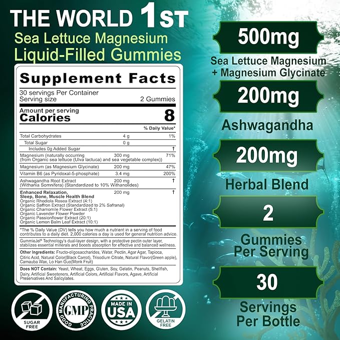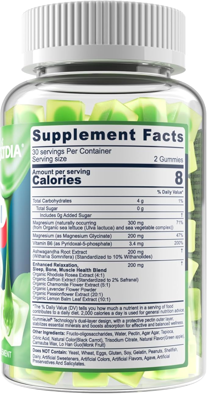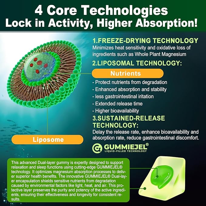 - FOUR CORE TECHNOLOGIES – LOCKING IN ACTIVITY, ENHANCING NUTRITIONAL STABILITY, ABSORPTION, AND BIOAVAILABILITY:Freeze-drying technology minimizes heat sensitivity and oxidative loss of the plant-based magnesium. Liposome technology protects magnesium and other nutrients from being destroyed by stomach acid. Sustained-release technology slows down the release rate of magnesium and other nutrients. GummieJel technology fills the center of gummy candies with nutrients, encapsulating and protecting them from air and high temperatures.
