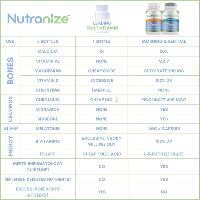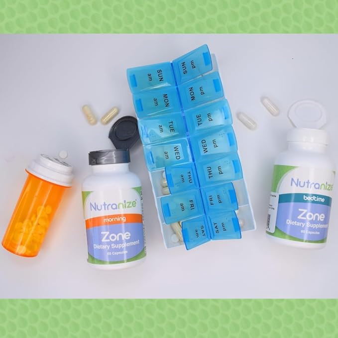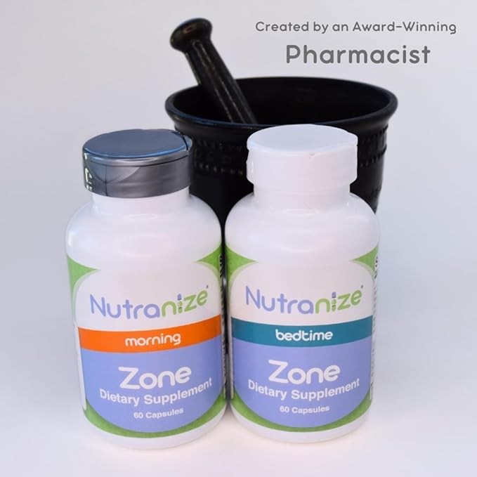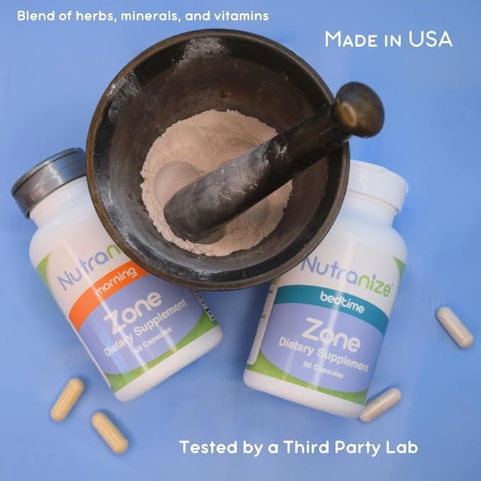 - All-In-One Twin Pack for Total Convenience: Simplify your routine with Nutranize Zone’s twin pack, featuring a Morning bottle and a Bedtime bottle. With 120 capsules providing a 30-day supply, this system delivers essential nutrients like calcium, magnesium, B vitamins, and vitamin D3 in one convenient solution.