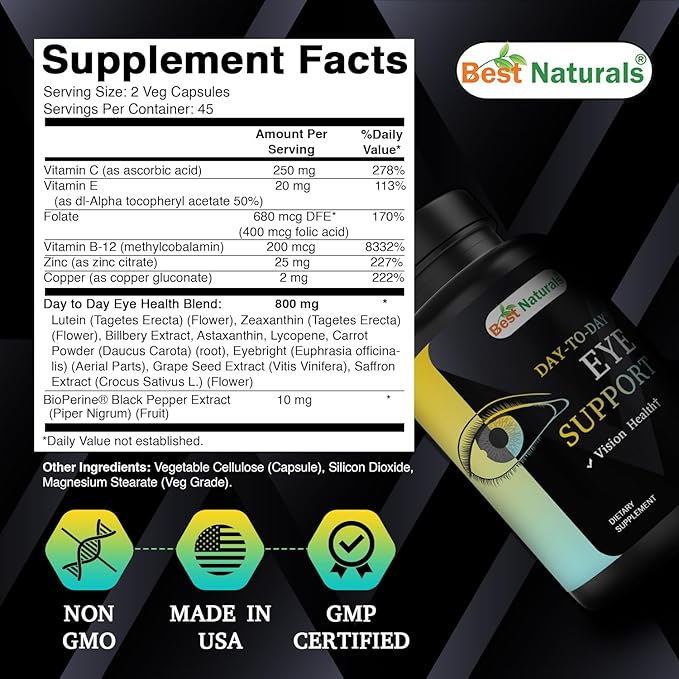 Best Naturals Day-to-Day Eye Support with Lutein, Zeaxanthin, Bilberry Extract, Astaxanthin, Lycopene, Carrot Powder 90 Veg Capsules