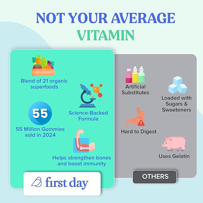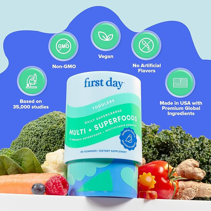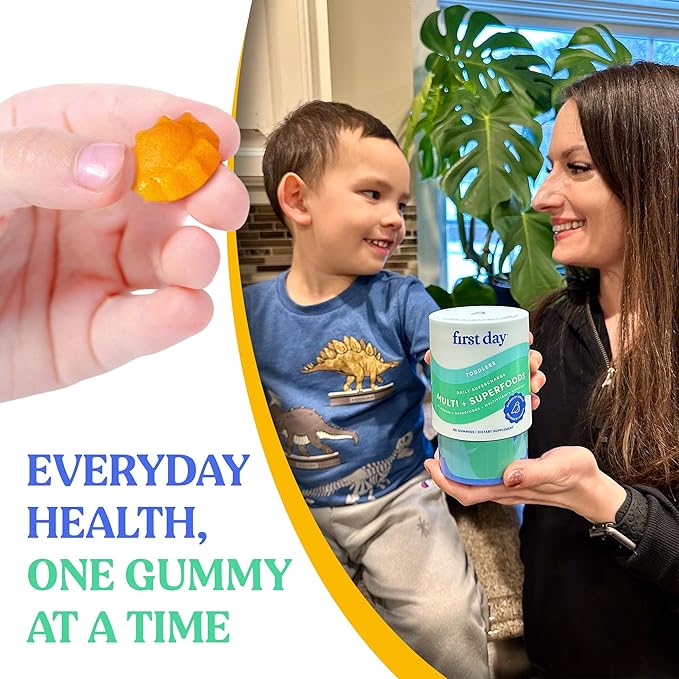 - Delight in Healthy Habits: Make vitamin time a treat with First Day's kids gummy vitamins! Our delicious, pectin-based gummies combine the benefits of a carefully crafted multivitamin with flavors your child will crave. Establish a positive routine that transform essential nutrition into a delightful experience, encouraging your little one to look forward to their daily dose of health, seamlessly integrated into your family's lifestyle. Clean Label Project Certified.