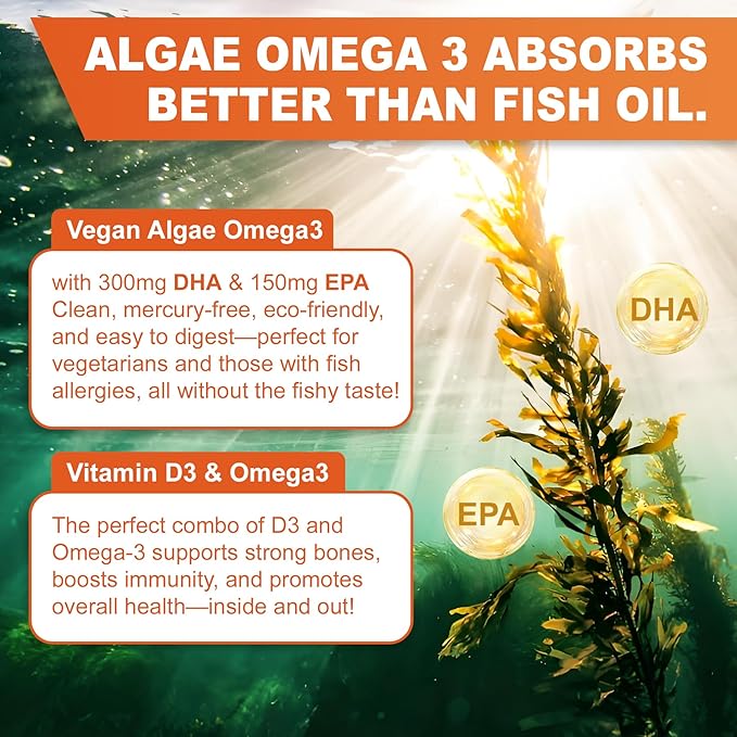 - 【Vegan Vitamin D3 5000 IU & Omega 3】Our formula delivers of Vitamin D 5000 IU from Lichen, perfect for those needing D3 without sunlight. Paired with 100% plant based Omega 3 supplement from algae, this supplement is ideal for vegans and anyone seeking an eco-friendly, fish-free source of essential fatty acids.