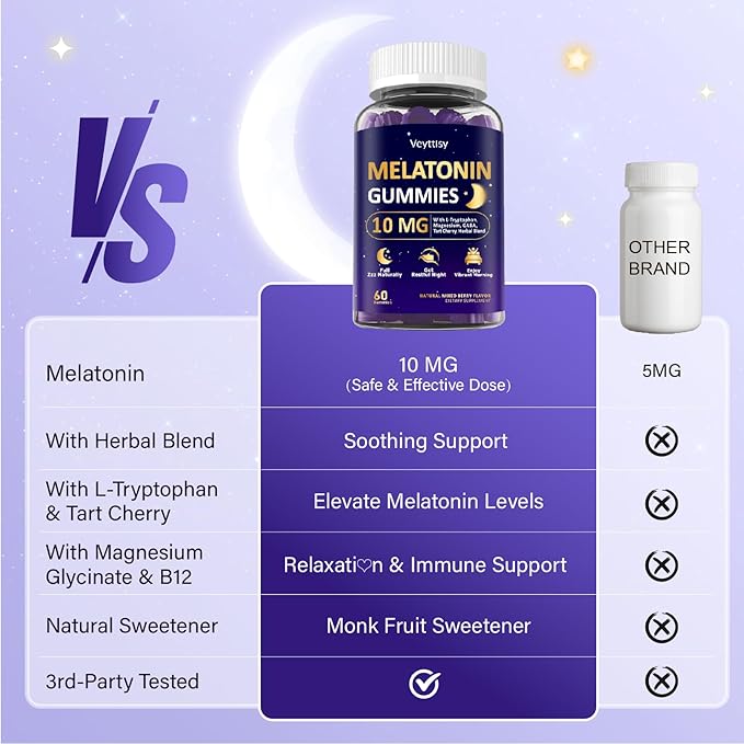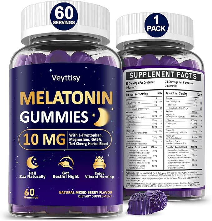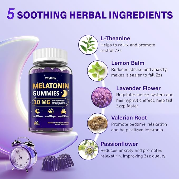 - POWERFUL NATURAL BLEND: Each serving of melatonin gummies 10mg contains GABA, L-theanine, and herbal extracts such as lemon balm, valerian root, passionflower and lavender. These natural ingredients help maintain inner peace, shorten Zzz time, and achieve a peaceful night with the best rest. Plus, our melatonin gummies for adults also contain magnesium and B12, which together support the immune system, improve overall body comfort, maintain a stable rest state, and further improve Zzz quality.