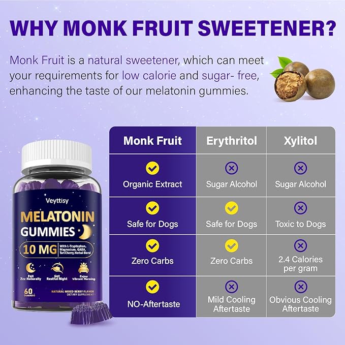 - NATURAL MONK FRUIT SWEETENER & MIXED BERRY FLAVOR GUMMIES: Struggling with capsules or tablets? Our SUGAR-FREE melatonin gummies are a delicious and guilt-free alternative! Infused with a NATURAL MIXED-BERRY FLAVOR and sweetened with MONK FRUIT, these melatonin gummies deliver a delightful taste without any aftertaste. Made with vegetarian and edible pectin, they are EASY TO CHEW AND D IGEST, and won't stick together—making them the perfect convenient and enjoyable nighttime treat for adults.
