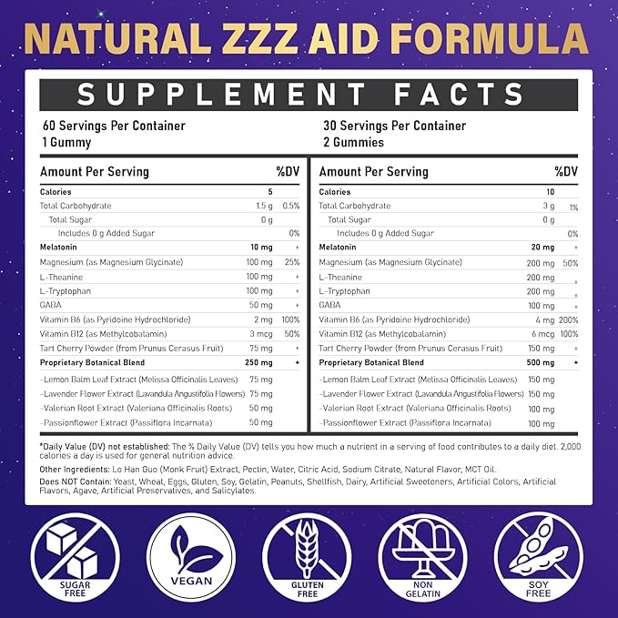 - NATURAL REST SUPPORT FORMULA: Our high potency melatonin gummies for adults offer an extra boost, with 10 mg / 20 mg melatonin per serving. Enriched with magnesium, L-theanine, L-tryptophan, GABA, B6, B12, Tart Cherry, and Natural Botanical Blend -- Lemon Balm, Valerian Root, Passionflower, and Lavender Extracts, our melatonin 10mg gummies not only promote a natural, comfortable and restful bedtime, ensuring sweet dreams,but also support a refreshed morning,enjoying a day full of vitality.
