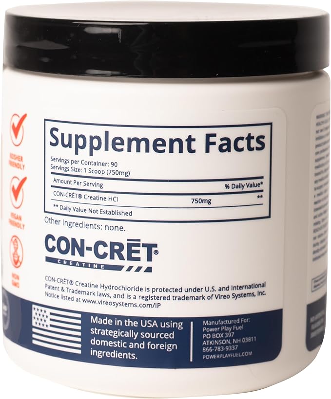 - Special Ingredients : CON-CRĒT® Creatine HCl, Gluten Free, Dairy Free, Soy Free