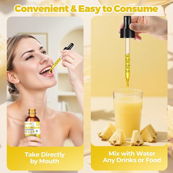 - Pineapple Flavored Liquid Magnesium: Say goodbye to pills and difficult-to-swallow capsules! Just 1 drip, you are free to go. Compare with the ordinary magnesium supplement like gummies, capsules or tablets, our liquid magnesium glycinate can be easier to consume and have a comparatively higher absorption rate.