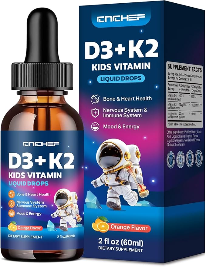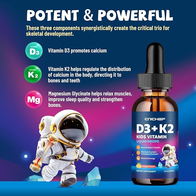 - SUPPORT BONE, HEART & IMMUNE HEALTH WITH K2+D3 SYNERGY: Our K2D3 Drops combine Vitamin D3 (400 IU) and high-potency MK-7 K2 (15 μg) with magnesium glycinate for triple-action support: strong bones, cardiovascular health, and immune defense. D3 boosts calcium absorption, while K2 directs calcium to your bones, minimizing arterial calcification. Ideal for active children aged 4+