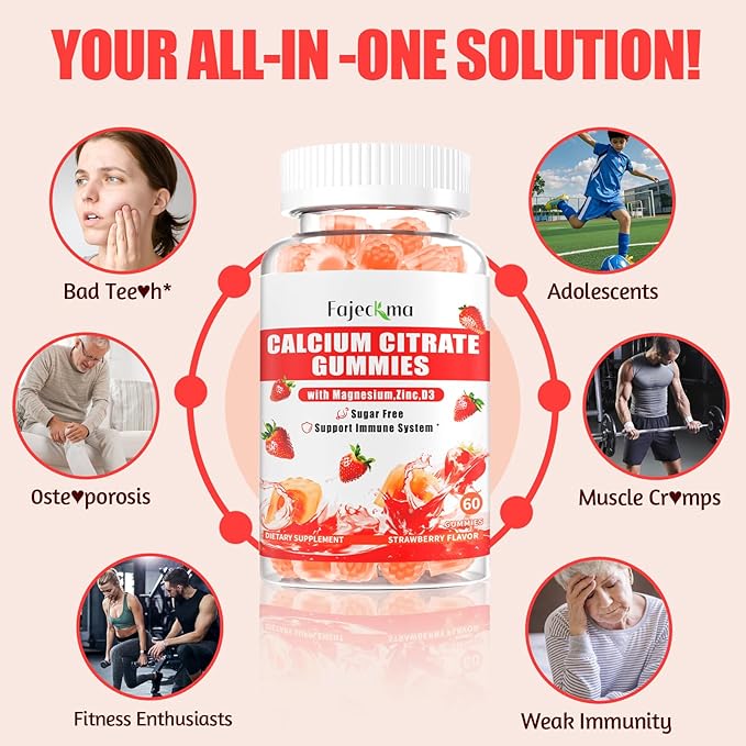 - Natural Fruit Flavor & Vegan-Friendly:These calcium supplement gummies come in a natural strawberry flavor. Sugar-free, gelatin-free, non-GMO, gluten-free, soy-free, wheat & yeast-free, 100% vegan, artificial color & flavoring-free. 3rd-Party Tested.