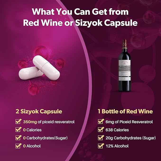 - Sizyok Ultra High Purity Resveratrol Supplement: This is a Full-spectrum red grape cell superfood containing polyphenols including Piceid Resveratrol which 100% extracted from red grape. Sizyok use the latest extraction technology" Ultrasound-Assisted Two-Phase Aqueous Method" to greatly improve the extraction rate of Piceid Resveratrol from red grape, and extract Piceid Resveratrol with higher purity and bioavailability from red grape.