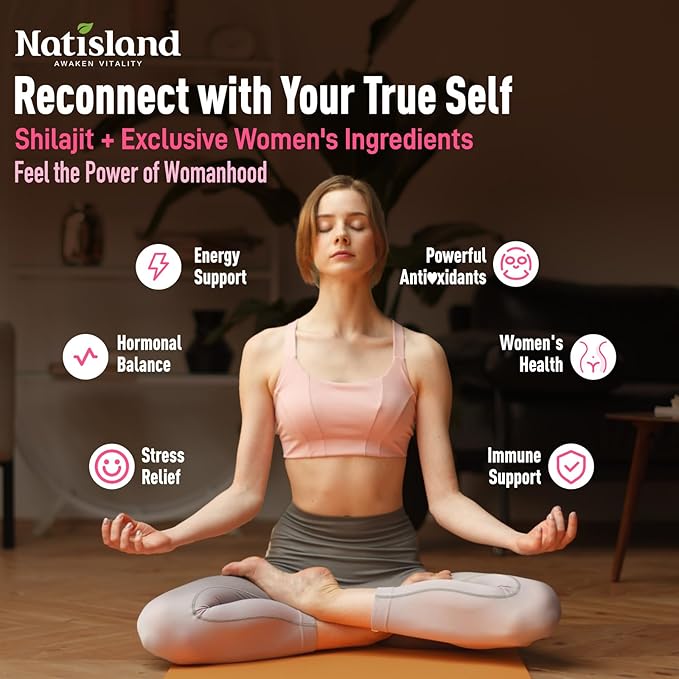 - Ladies' Choice: Our shilajit capsules are specially formulated for women's health, featuring Dong Quai, Evening Primrose Oil, and Cranberry to support skin wellness, hormonal balance, and overall vitality. Suitable for women of all ages, Natisland shilajit for women helps maintain a healthy, balanced lifestyle, making it a supportive supplement at any stage of life