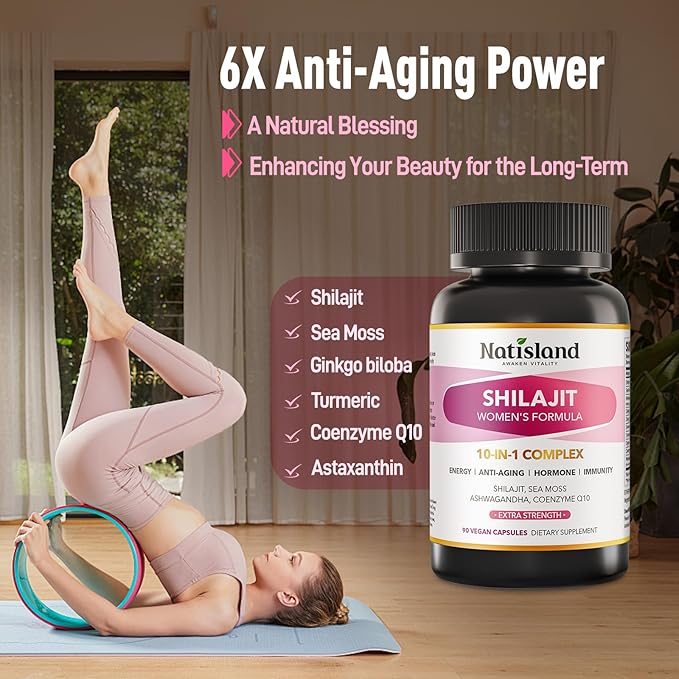 - Natural Energy Support: The powerful energy-boosting benefits of pure shilajit are widely recognized. Natisland shilajit for women capsules combine shilajit, ashwagandha, and sea moss to help reduce fatigue, manage stress, and support energy levels. Infused with five potent antioxidant-rich ingredients, this formula offers anti-aging support and promotes skin and bone health, revitalizing your body from the inside out