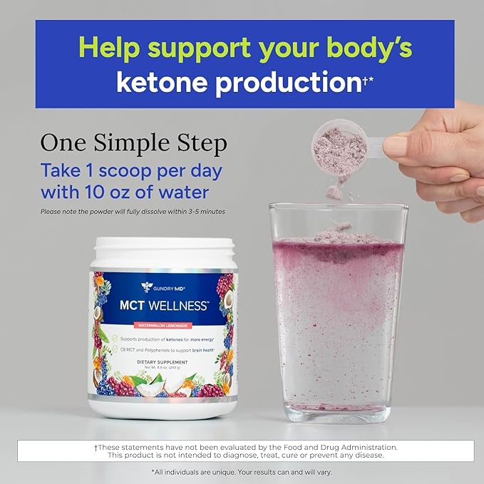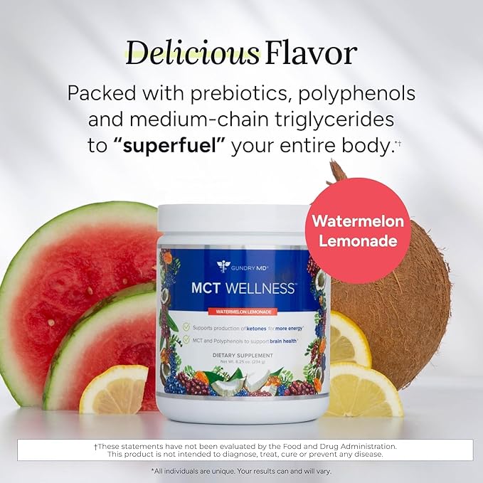 Gundry MD MCT Wellness Powder to Support Energy, Ketone Production and Brain Health, Keto Friendly, Sugar Free (90 Day Supply, Watermelon Lemonade)
