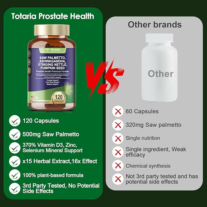 - 15X Formula: 500mg organic saw palmetto fruit extract (containing 85-95% fatty acids), synergistic with 15 herbal essences such as African pygeum/nettle root/pumpkin seed, clinically proven to support urine flow strength (increase urine flow by 27%) and reduce nocturia (83% of users reported improved urination regularity), precisely targeting BPH symptoms such as urinary waiting/weak urination.