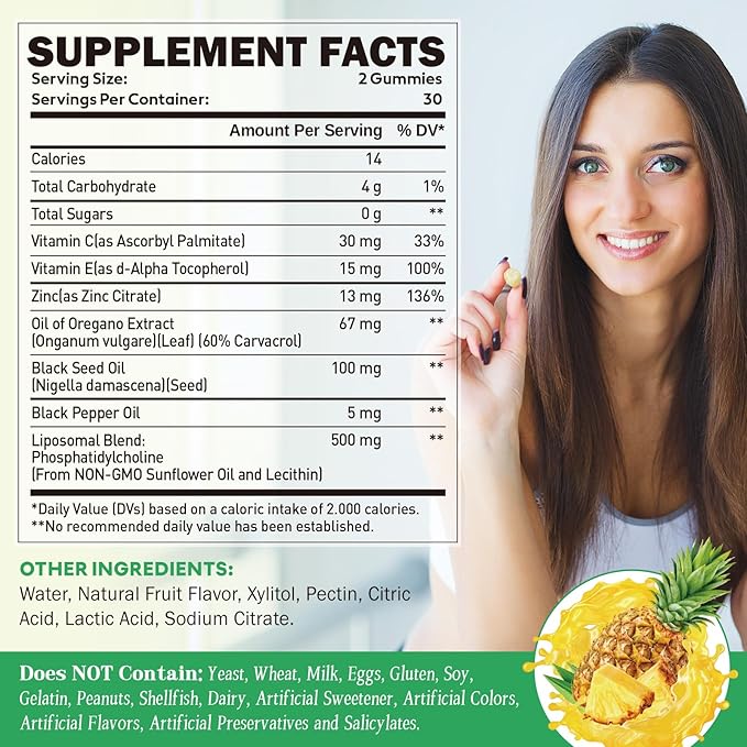Liposomal Oregano Oil Gummies, Organic Chewable Oil of Oregano with Black Seed Oil for Kids & Adults, Immune System & Gut Health, Natural Pineapple Flavor, 60 Count
