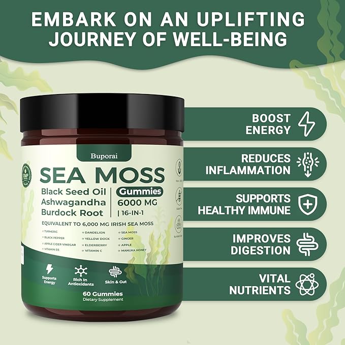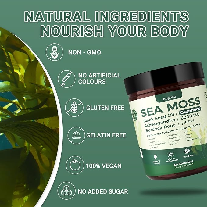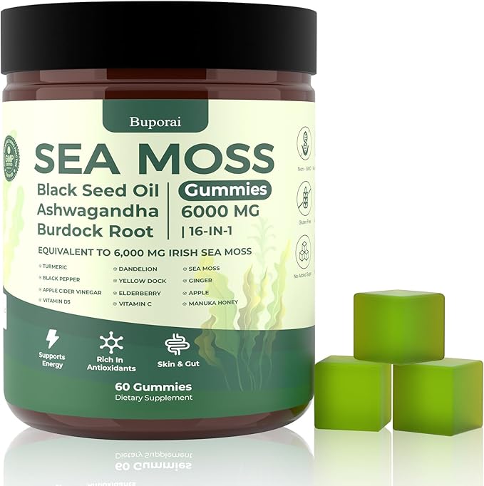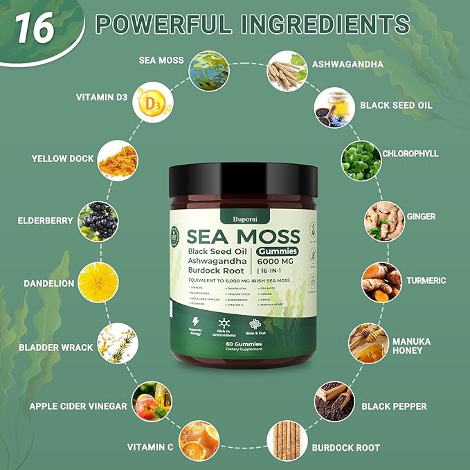 - SUPERFOOD – Each gummy packs 6000mg of Irish Sea Moss extract, rich in natural iodine, iron, magnesium, and essential trace minerals. Enhanced with Bladderwrack, Burdock Root, and a total of 16 synergistic ingredients, this formula is designed to energize your body and support overall wellness