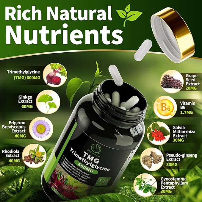 - Advanced Formula & Rich Nutrition: The BBEEAAUU TMG (Trimethylglycine) Supplement Capsules contain 600mg of trimethylglycine (TMG), ginkgo biloba extract 60mg, erigeron breviscapus extract 40mg, salvia miltiorrhiza extract 30mg, gynostemma pentaphyllum extract 30mg, pseudo-ginseng extract 30mg, grape seed extract 20mg and 1.7mg vitamin B6. Our TMG capsules provides a truly balanced basic nutritional blend that meets your daily energy needs.