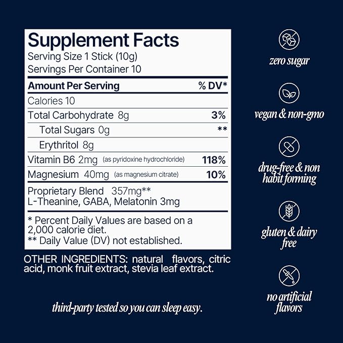 - Science Backed Formula - Our powder is packed with clean, high quality ingredients. Magnesium & Vitamin B6 help make sure your sleep cycle is running smoothly. L-Theanine & GABA promote relaxation. Melatonin jumpstarts the natural process of falling asleep.
