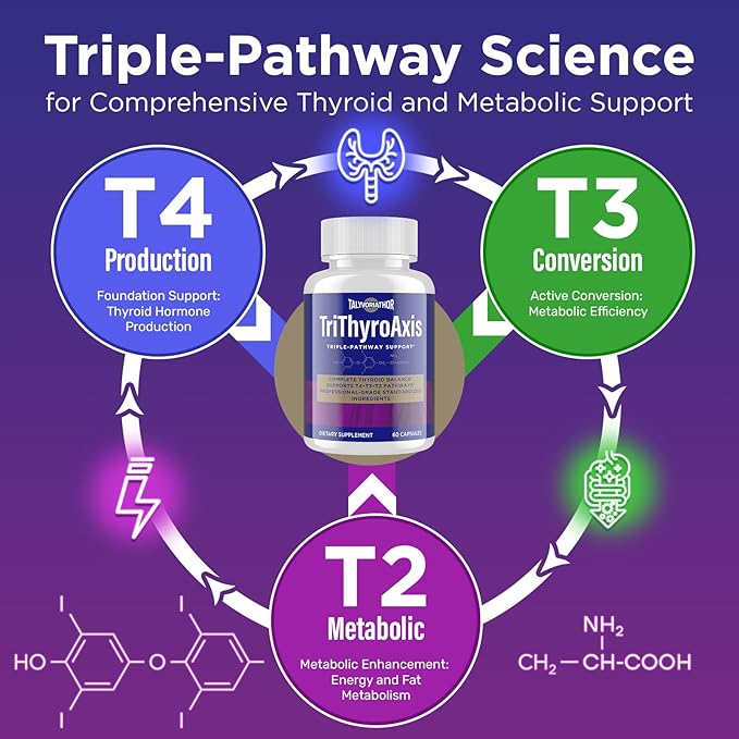- TriThyroAxis Innovative Triple-Pathway Formula: TriThyroAxis is a patented formula uniquely designed to support T4 production, T3 conversion, and T2 metabolism. Its name reflects its function: "Tri" for the three thyroid pathways, "Thyro" for its thyroid hormone focus, and "Axis" for its role in endocrine balance. This advanced approach makes thyroid support a more comprehensive and effective solution compared to conventional thyroid supplements.