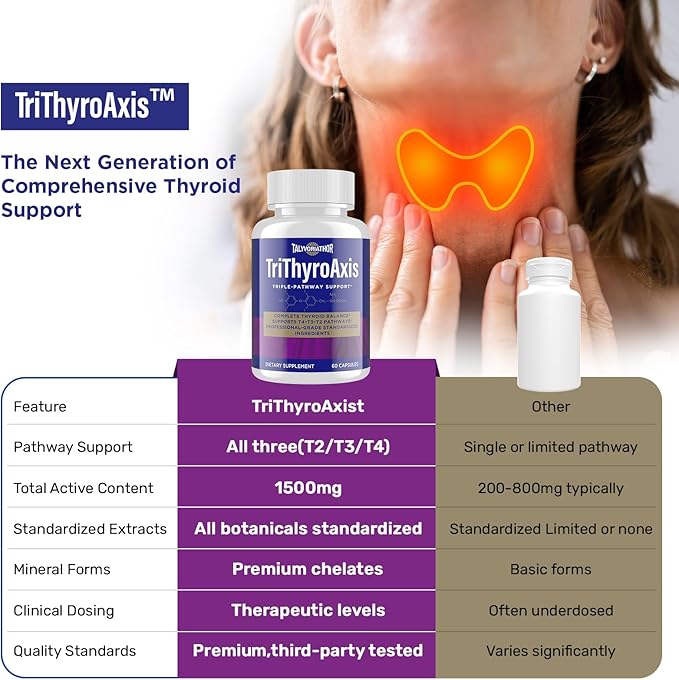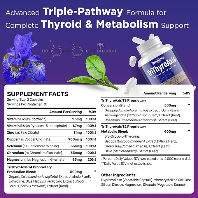 - Advanced Triple-Pathway Thyroid Support: Emerging research shows that supporting all three thyroid pathways is key to optimal thyroid wellness. TriThyroAxis is the first thyroid supplement scientifically designed formula to support T4 production, T3 conversion, and T2 metabolism in one. Unlike competitors that target just one pathway, TriThyroAxis support for women provides comprehensive thyroid balance for energy and metabolism.