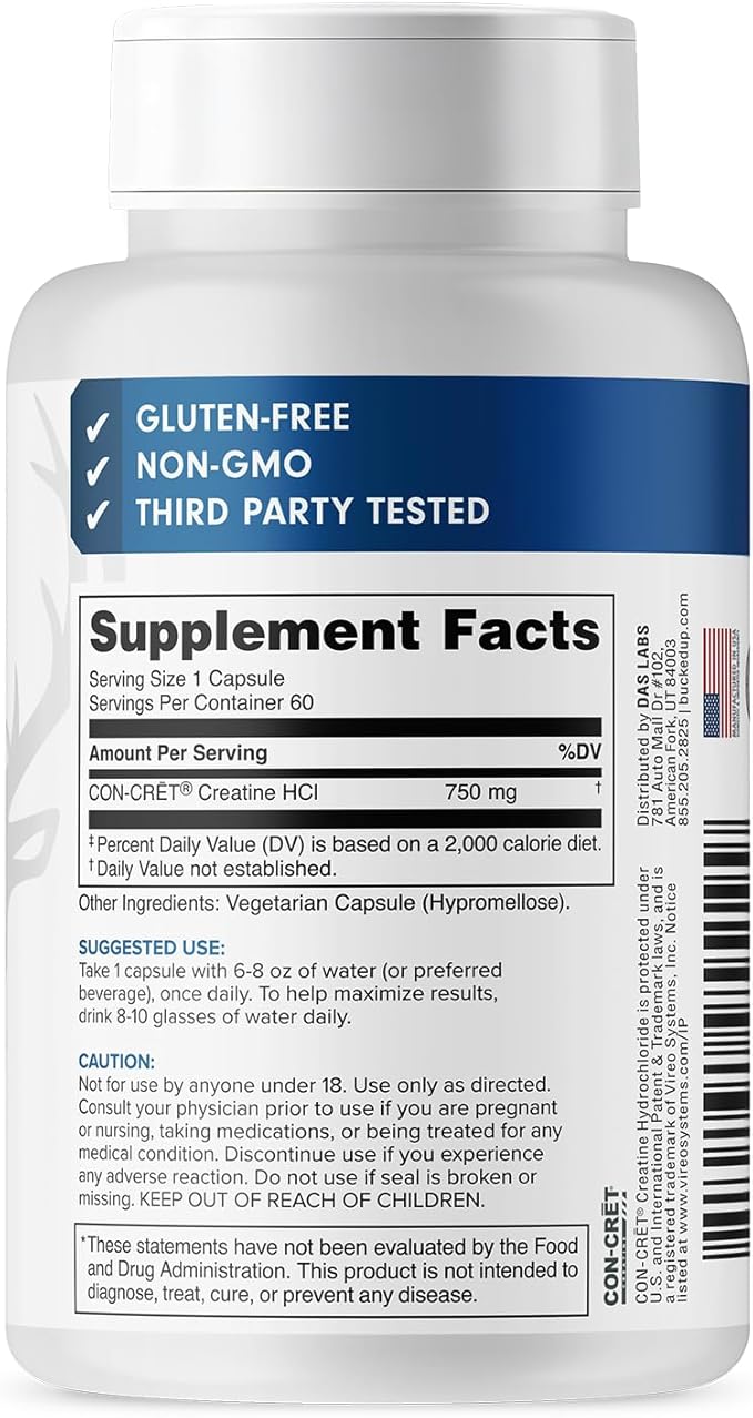 - HIGH-POTENCY FORMULA – 750mg CON-CRET Creatine HCl per capsule, a concentrated form of creatine hydrochloride.