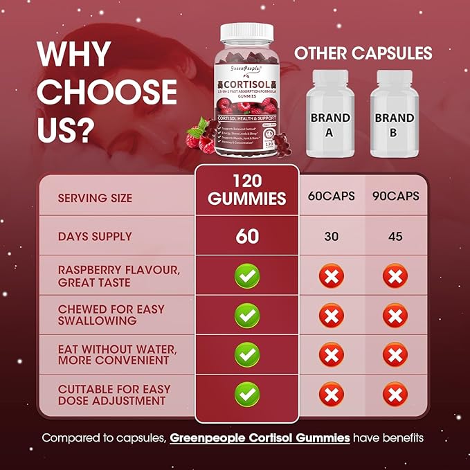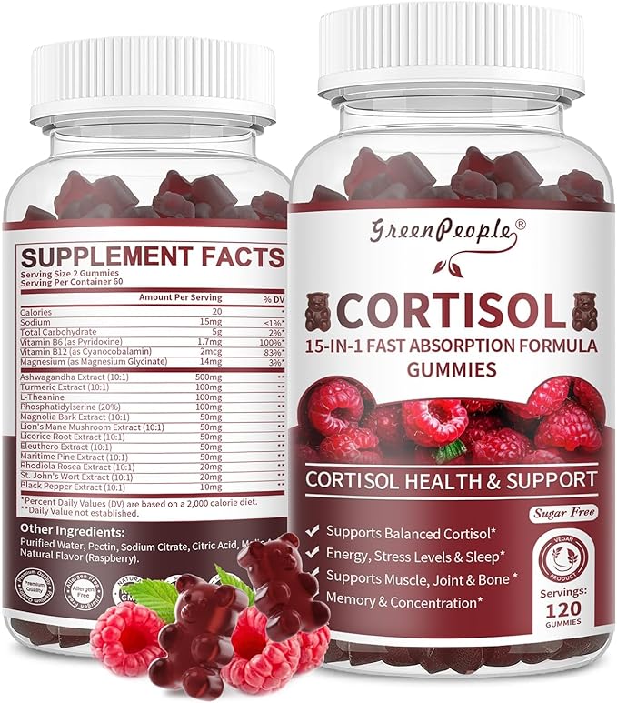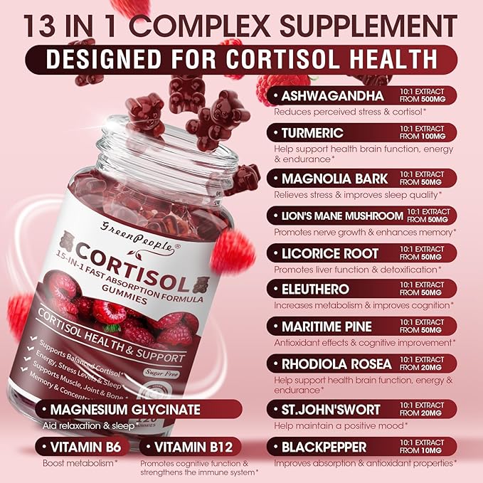 - CORTISOL SUPPLEMENT FOR WOMEN: GREENPEOPLE's Cortisol Gummies are made with a premium formula that contains a wide range of nutrients that women need, including Ashwagandha,Turmeric,L-Theanine,Phosphatidylserine,Magnolia Bark,Hericium Erinaceus,Licorice Root,Eleutherococcus,Maritime Pine,St. John's Wort,Black Pepper,and more.These ingredients work synergistically to support cortisol balance and overall well-being, making them an ideal cortisol detox solution for women