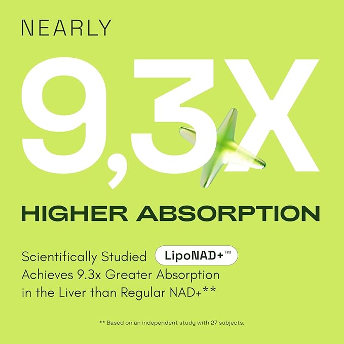 - 9.3x GREATER ABSORPTION: 250 mg LipoNAD enhances bioavailability, delivering superior absorption compared to regular NAD+*.