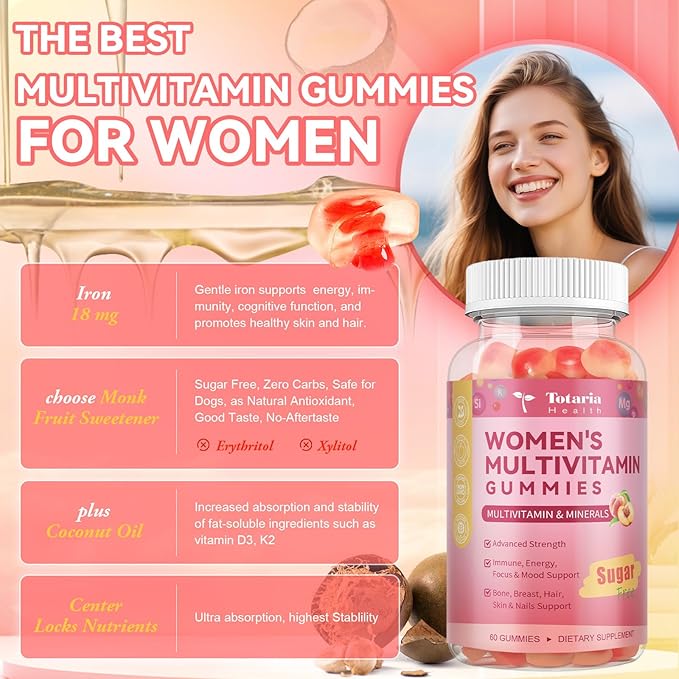 - Essential Minerals for Overall Health: Key minerals such as Calcium, Iron, Magnesium, Zinc, Chromium, Molybdenum, and Potassium are included. These minerals contribute to bone health and immune support. Suitable for Women, ages 14+. Whether you are a 40+, 50+ women, you can feel confident with your health from Totaria multivitamin gummies.