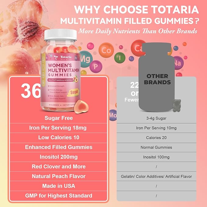 - Upgraded Filled Multivitamin Gummies with Iron: Totaria multivitamin filled gummies is a special form of gummies. Compared to traditional gummies, Totaria women multivitamin filled gummies are packed with central nutrients that lock in activity and stability, giving you the highest bioavailability and absorption.
