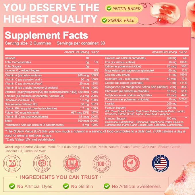 Sugar Free Multivitamin Gummies for Women 14+ w/Iron, Inositol, Folate, Biotin, Womens Daily Multivitamin Gummy w/Vitamin A, C, B, D3, K2, for Hair, Skin, Energy, Immune, Peach Flavor