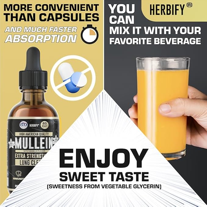 HERBIFY Mullein Drops - Lung Cleanse - Leaf Extract - Powerful Mullein for Immune Support, Detox & Respiratory Support - Made in USA - 4 Oz Vanilla Flavor